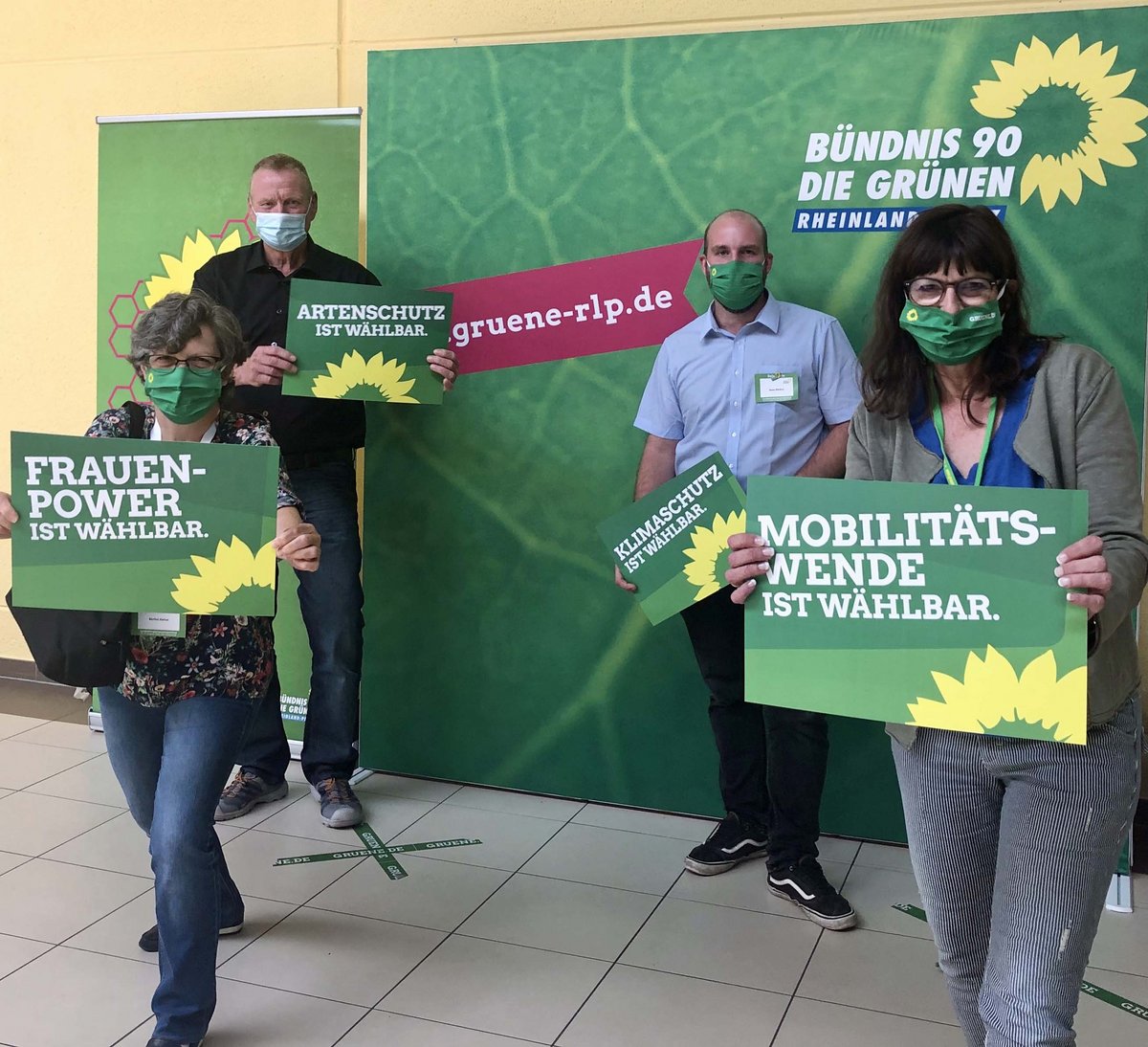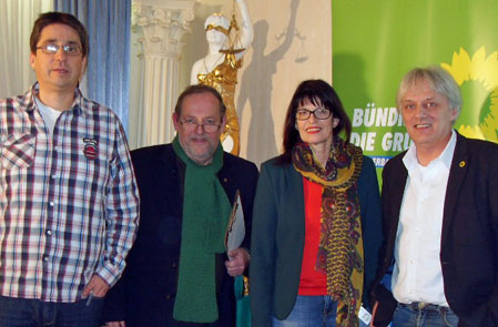 (v.l.n.r.) Jutta Paulus, MdEP, Birgit Meyreis, Landesschatzmeisterin, Anne Spiegel, Staatsministerin für Fraauen, Familie, Jugend, Integration und Verbraucherschutz und GRÜNE Spitzenkandidatin, und Josef Winkler, Landesvorsitzender