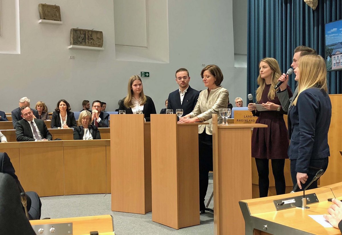 In Kooperation mit der Bertelsmann Stiftung gab der Landtag Rheinland-Pfalz Jugendlichen die Chance im Plenarsaal gemeinsam zu diskutieren und in einen offenen Dialog mit Politikerinnen und Politiker zu treten. Im Fokus stand die Frage: „Wahlbeteiligung und Mobilisierung von Jungwählern – wie sieht zeitgemäßes Wählen aus?“. Auch Ministerpräsidentin Malu Dreyer beteiligte an der Diskussionrunde.