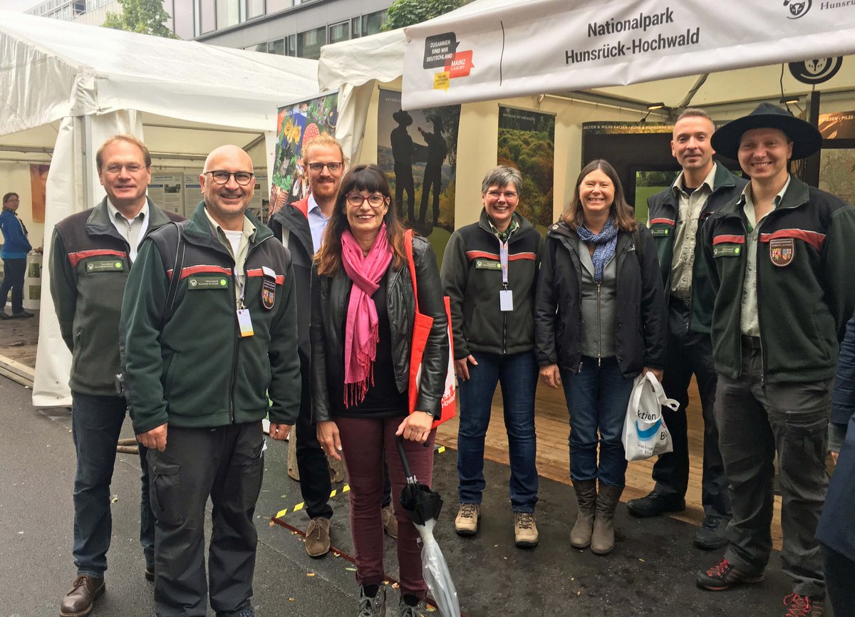 (v.l.) Dr. Harald Egidi, Leiter des Nationalparks Hunsrück-Hochwald, Guido Lotz aus Bernkastel-Kues, verantwortlich für die Öffentlichkeitsarbeit, Jutta Blatzheim-Roegler, Ministerin Ulrike Höfken und weitere Mitglieder des Nationalpark-Teams vor dem Infostand zum ersten rheinland-pfälzischen Nationalpark.