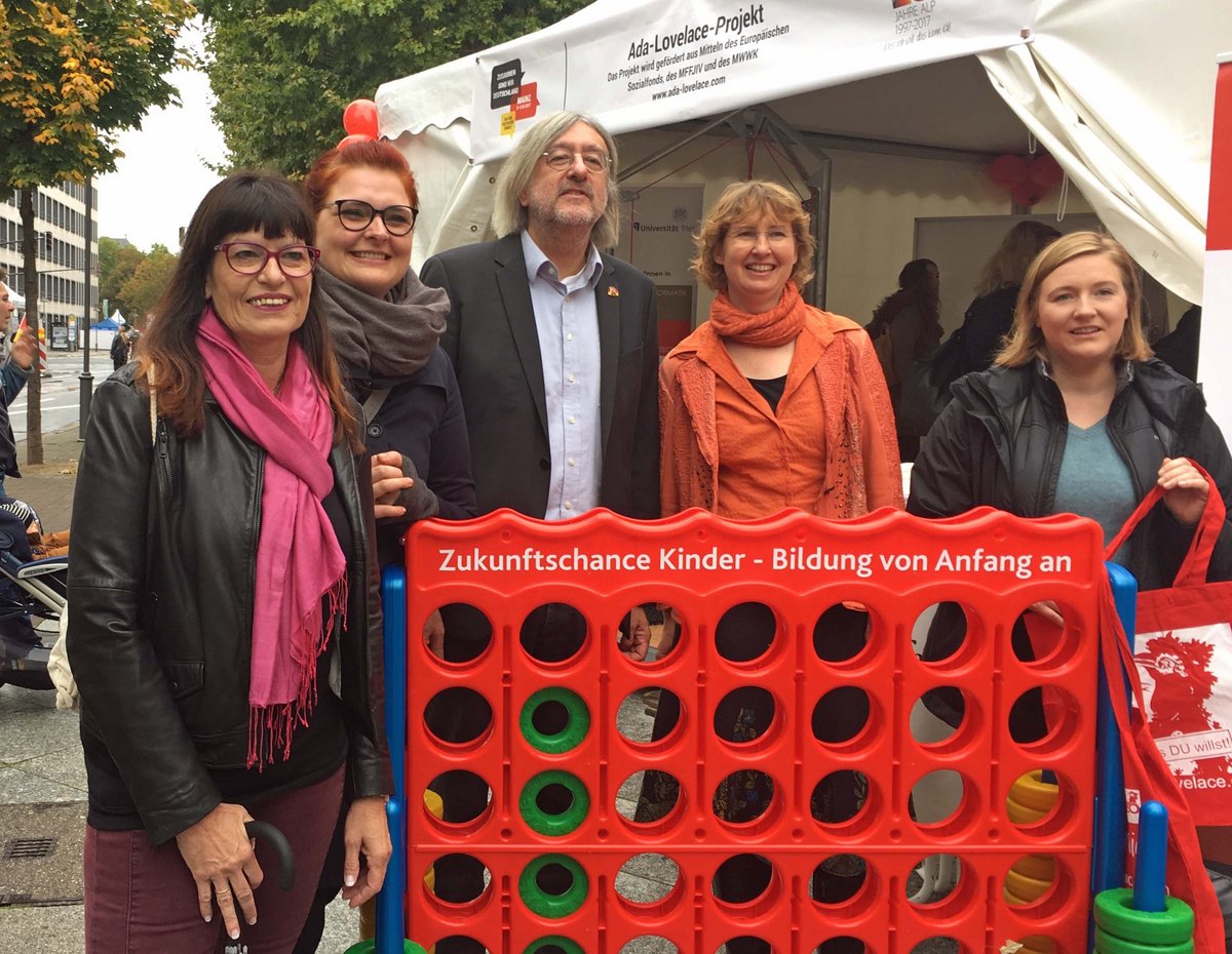 Jutta Blatzheim-Roegler mit den Fraktionskollegen Pia Schellhammer, Bernhard Braun und Katharina Binz (v.l.n.r.) sowie Staatssekretärin Christiane Rohleder (zweite von rechts) beim Besuch des Infostands zum Ada Lovelace Projekt.